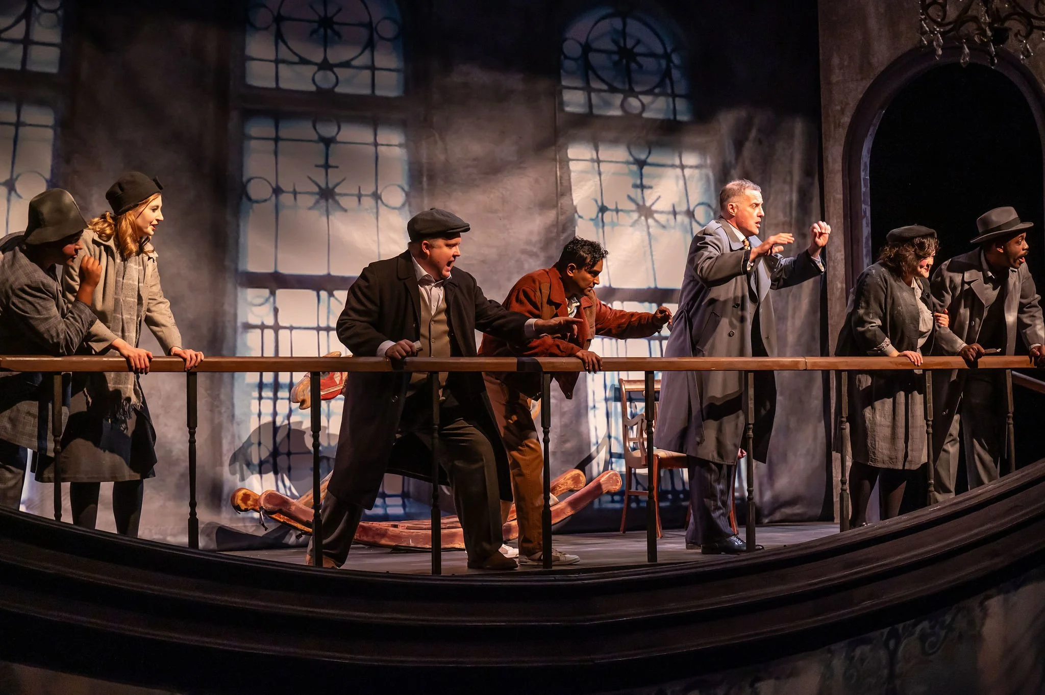 Actors performing a dramatic scene on stage, with vintage costumes and a backdrop of large windows.