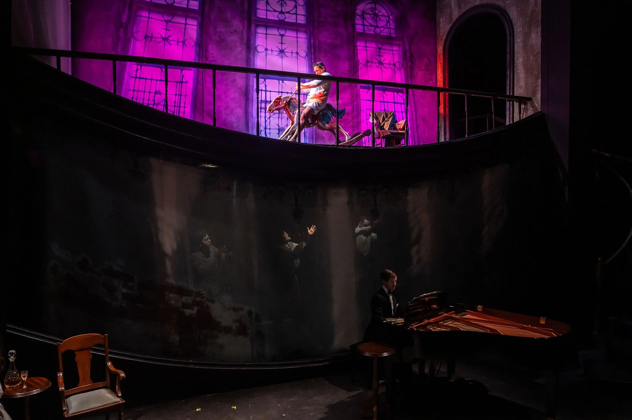 Theatrical scene with a performer riding a horse-like figure on a balcony, a musician playing a grand piano below, and projected images of people on a curved wall.